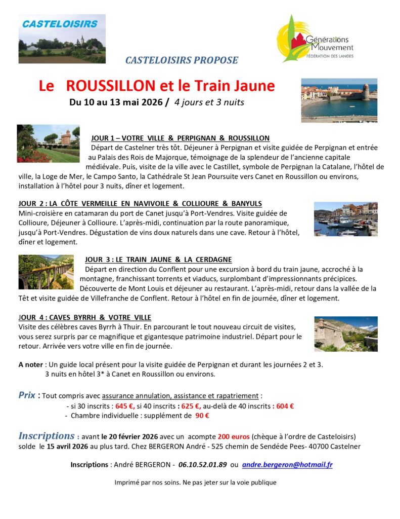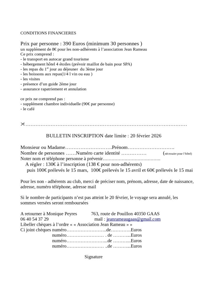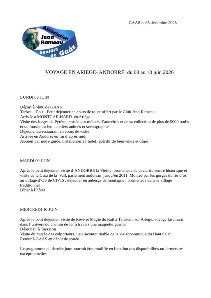 Bonjour, l’Association Jean Rameau à Gaas est un club qui n’a pas assez d’adhérents pour faire un voyage, alors si vous rencontrez le même problème venez avec nous en Ariège du 08 juin au 10 juin 2026 nous serons heureux de partager ce moment. Contact : Monique – 06 40 54 37 29